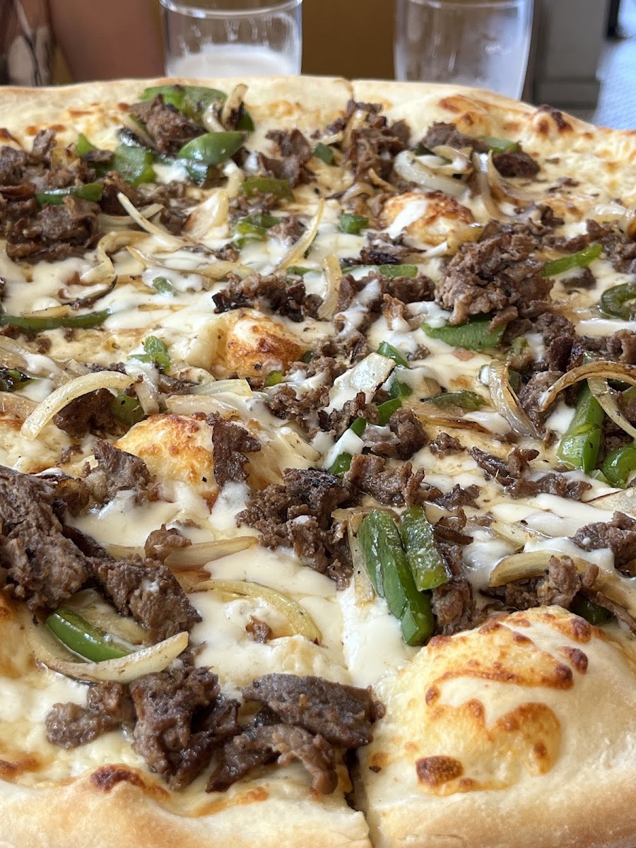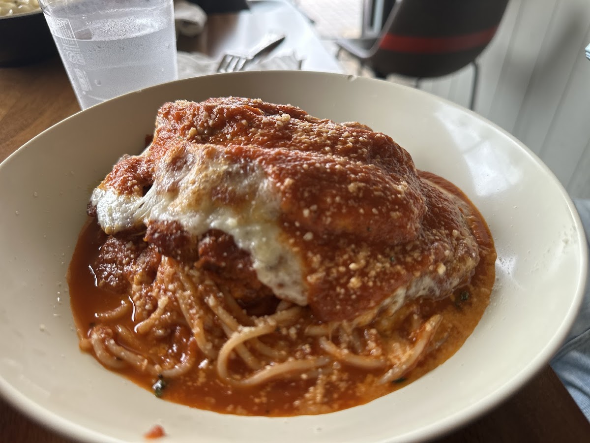 Our first time here and food was delicious. Bigger portions than I expected for the price. We ordered the garlic bread with cheese, chicken parmesean with spaghetti, calamari, and Repetti's specialty pizza. My picky 4 year old tried every dish and gave a 2 thumbs up review! We dined in for lunch and service was attentive and quick. 3 stars for atmosphere because it was too hot for me dining inside--wish there was more a/c.